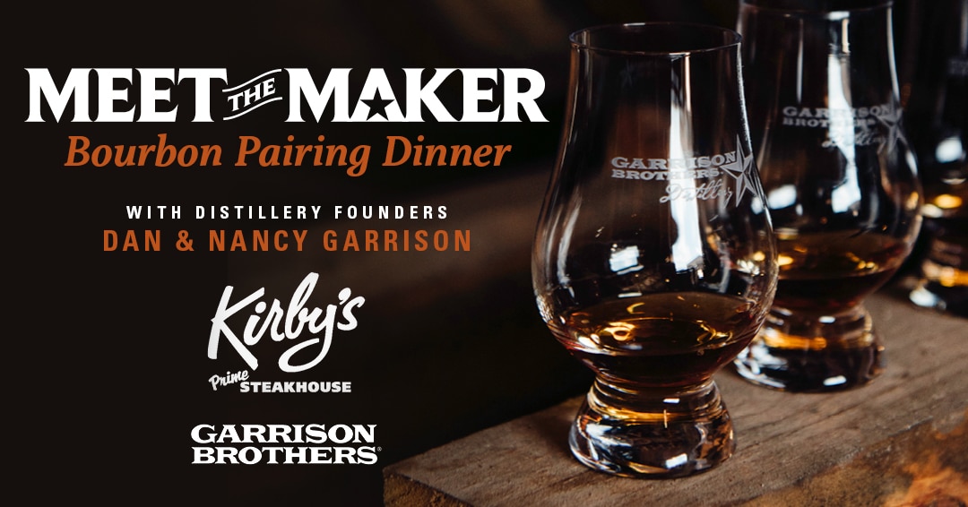 Join us for a Meet the Maker Bourbon Pairing Dinner at Kirby’s Steakhouse with founders Dan and Nancy Garrison. Savor an evening of fine dining featuring a chef curated menu designed to complement the bold flavors of Garrison Brothers bourbon. Tickets are priced at $150.