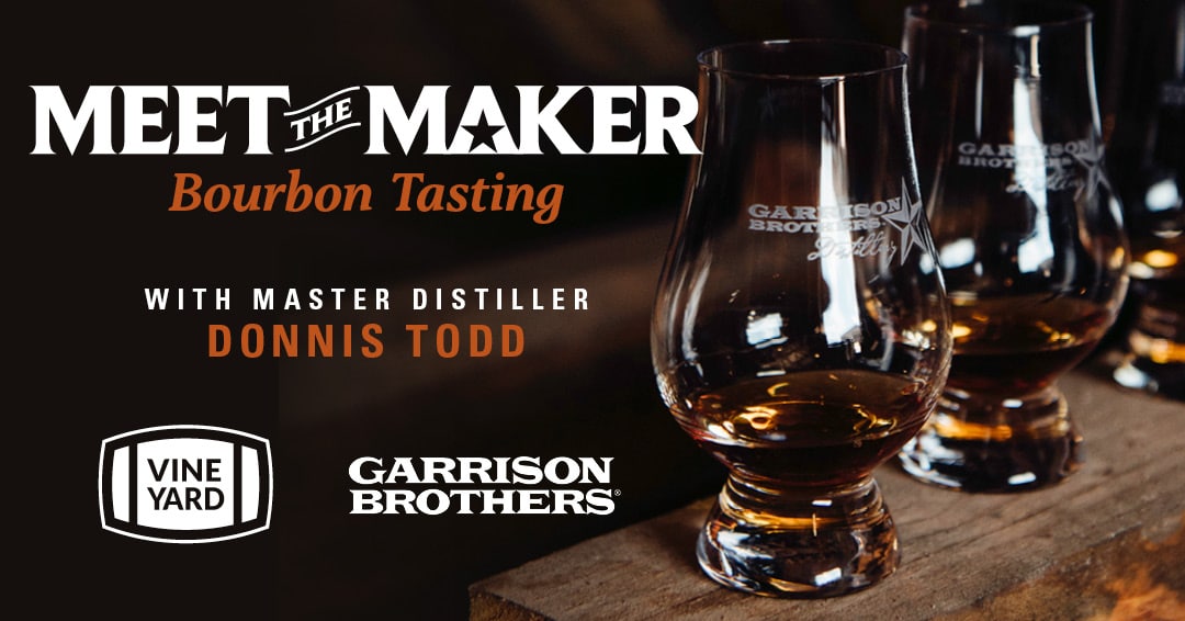 Join us for a Meet the Maker Bourbon Tasting at The Vineyard with Master Distiller Donnis Todd and Scott Unruh. Experience the legendary flavors of Garrison Brothers with a tasting of Small Batch, HoneyDew, Single Barrel, and Balmorhea bourbons. Plus, don’t miss the chance to have your bottles signed by Donnis himself. This event is free and open to the public.